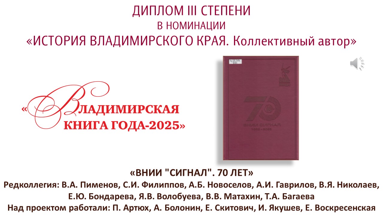 Диплом 3 степени получила книга «ВНИИ «Сигнал». 70 лет», редакционная коллегия: В.А. Пименов, С.И. Филиппов, А.Б. Новоселов, А.И. Гаврилов, В.Я. Николаев, Е.Ю. Бондарева, Я.В. Волобуева, В.В. Матахин, Т.А. Багаева, над проектом работали: Полина Артюх, Александр Болонин, Евгений Скитович, Илья Якушев, Екатерина Воскресенская.