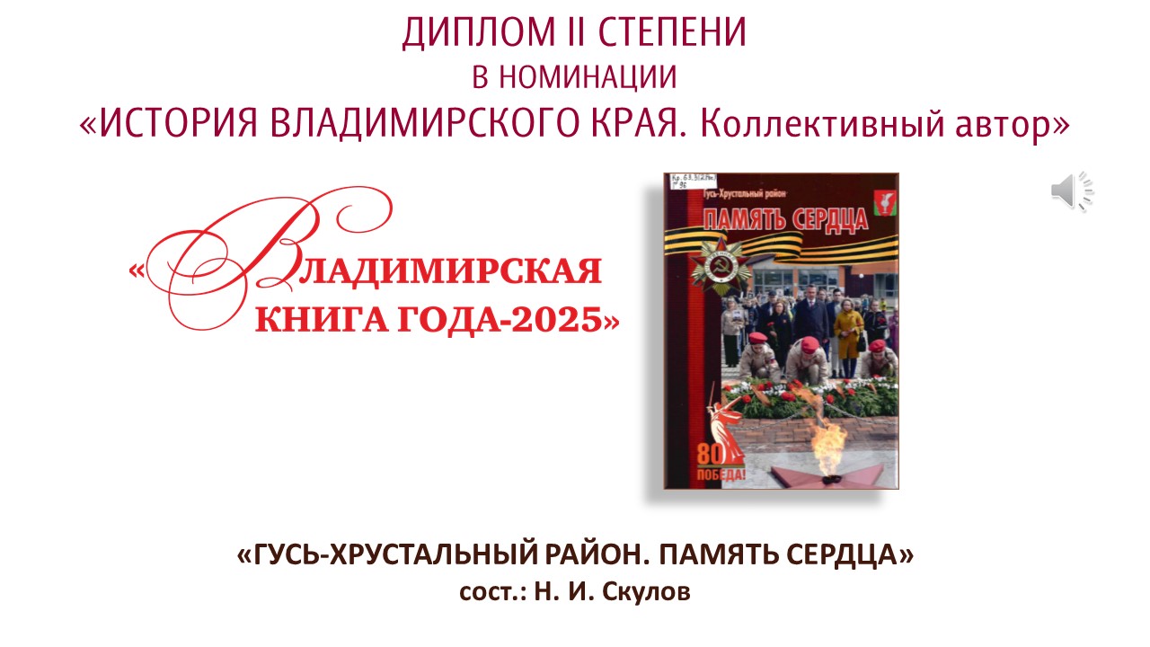 Диплом победителя 2 степени получила книга «Гусь-Хрустальный район. Память сердца», составитель Николай Игоревич Скулов.