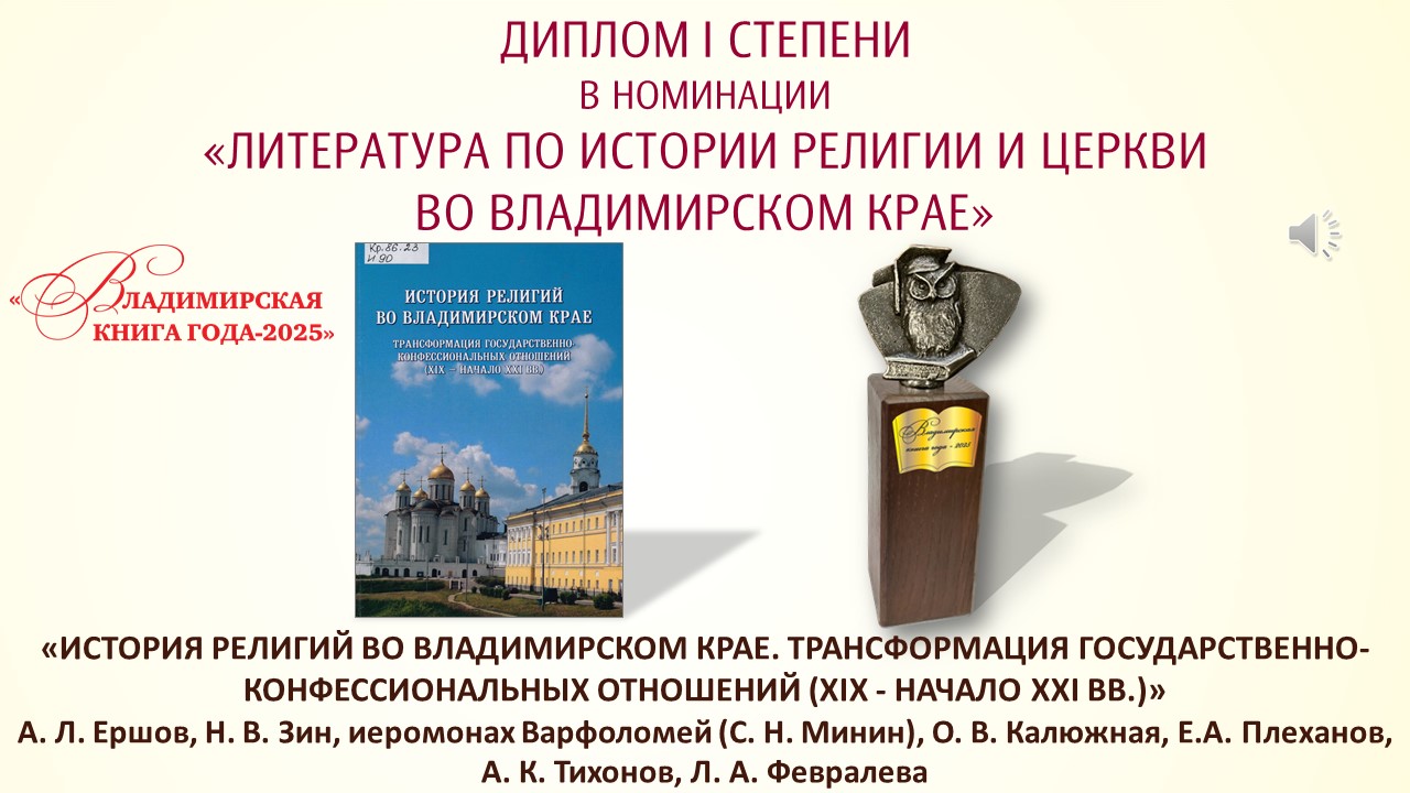 Диплом победителя 1 степени и памятный знак получила монография «История религий во Владимирском крае: трансформация государственно-конфессиональных отношений (XIX – начало XXI вв.)» – награду получил большой авторский коллектив: Андрей Леонидович Ершов, Наталья Васильевна Зин, иеромонах Варфоломей (С.Н. Минин), Ольга Васильевна Калюжная, Евгений Александрович Плеханов, Андрей Константинович Тихонов, Лилия Анатольевна Февралева.