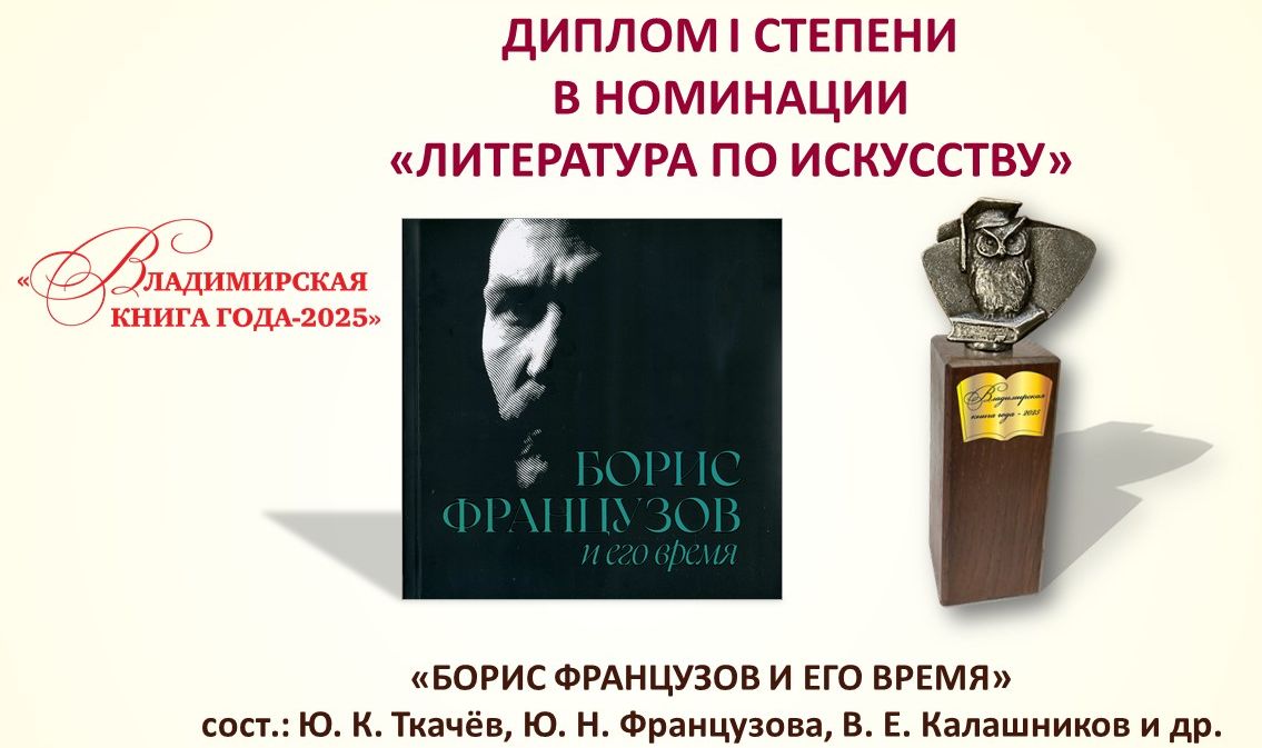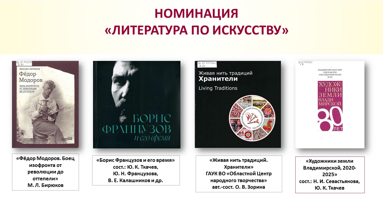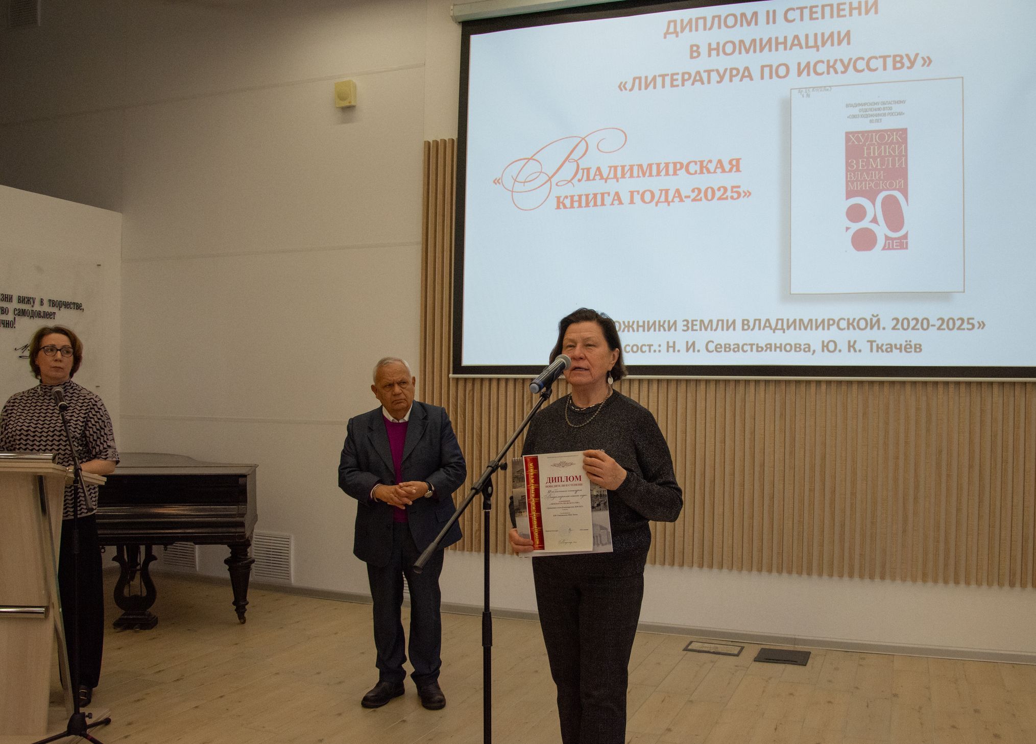 Дипломом победителя 2 степени получила книга «Художники земли Владимирской. 2020-2025», составители: Надежда Игоревна Севастьянова, Юрий Константинович Ткачёв.
