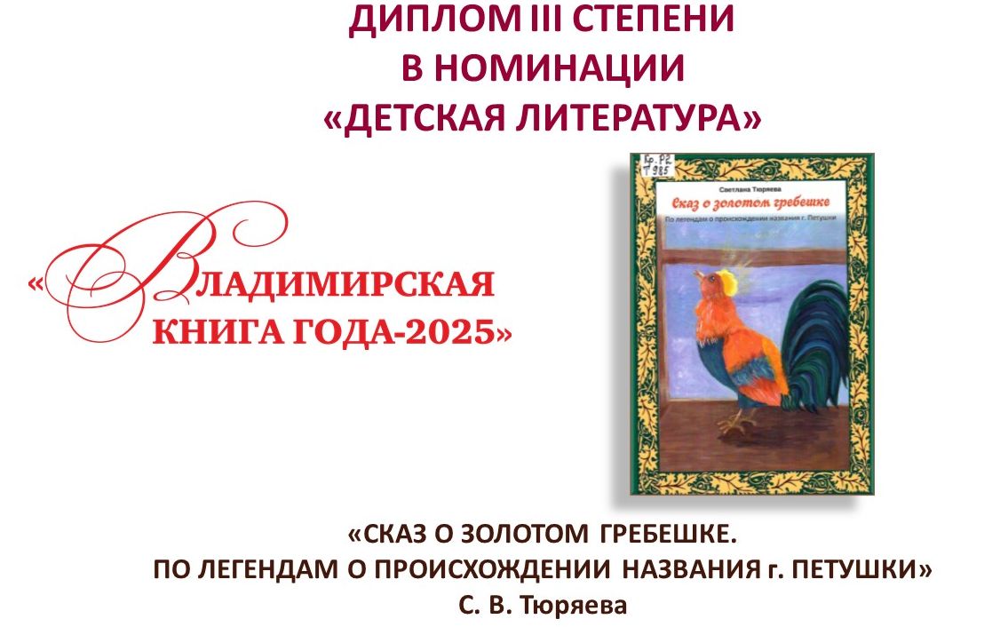 Дипломом 3 степени в данной номинации награждена книга «Сказ о золотом гребешке» (по легендам о происхождении названия г. Петушки), автор Светлана Викторовна Тюряева.