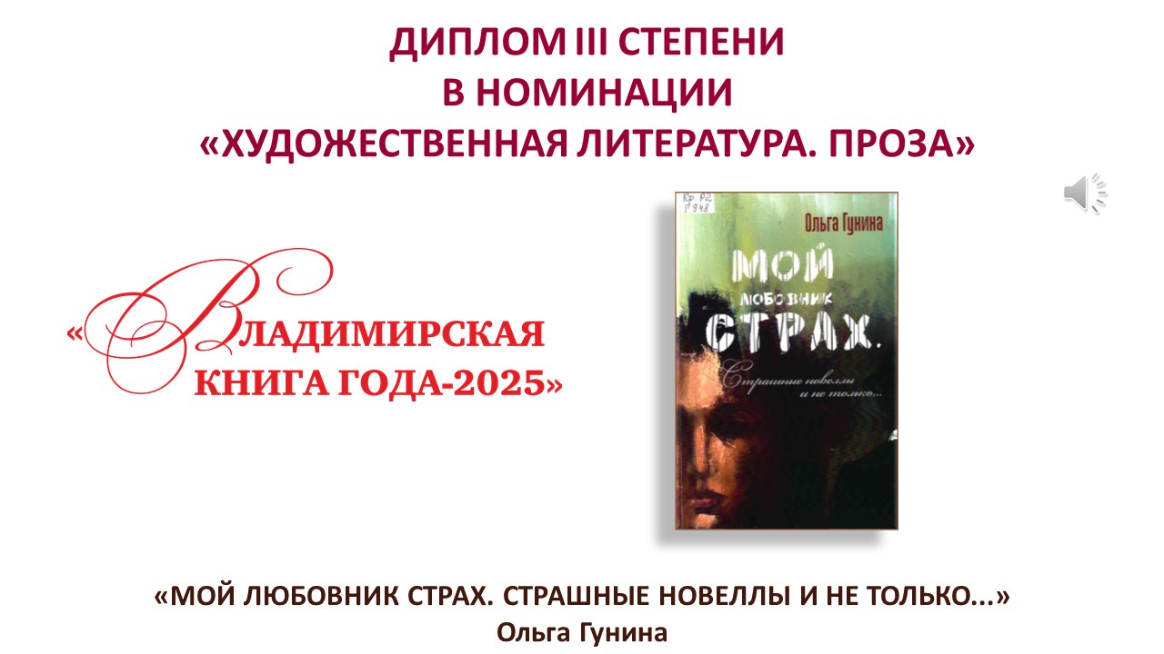 Дипломом 3 степени награждена книга «Мой любовник Страх: страшные новеллы и не только…», автор Ольга Владимировна Гунина.
