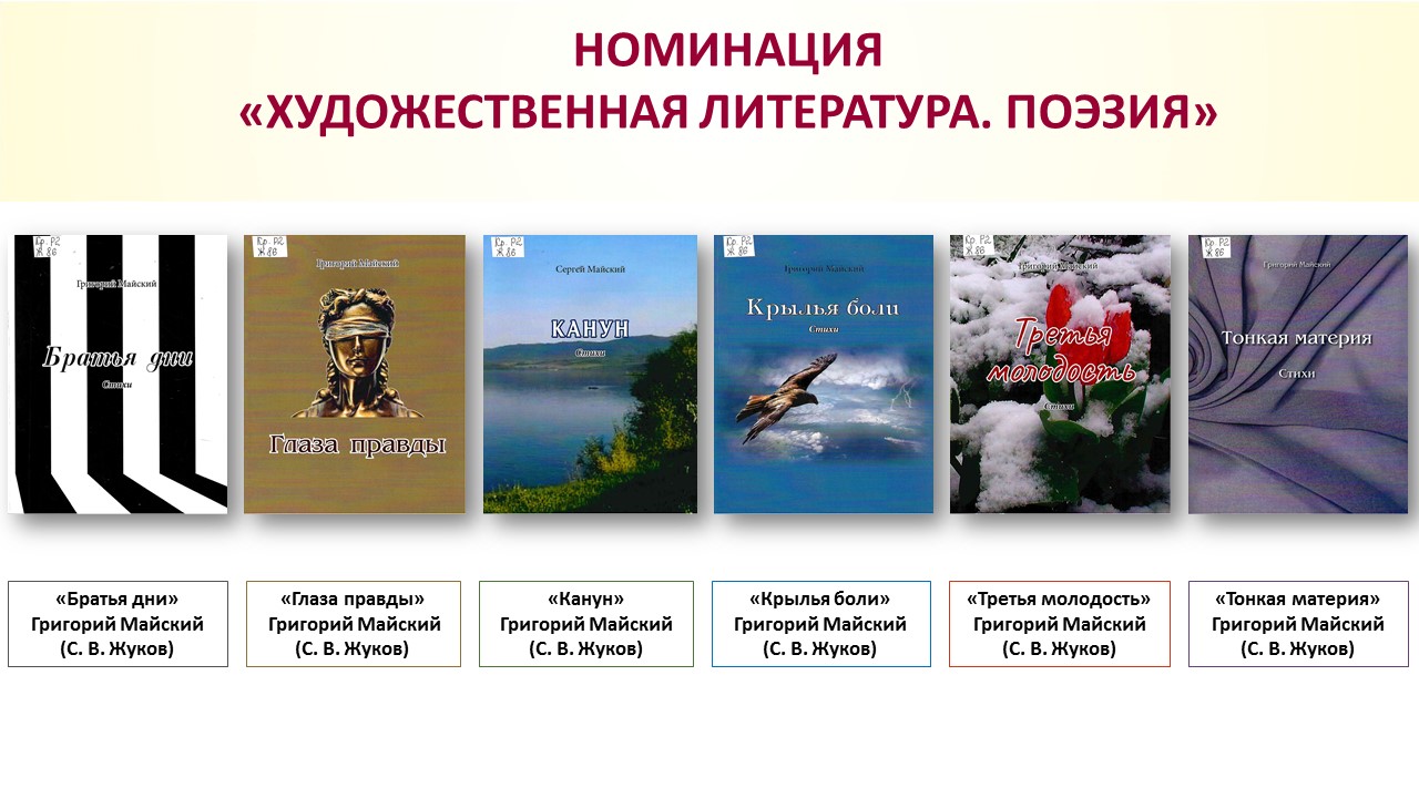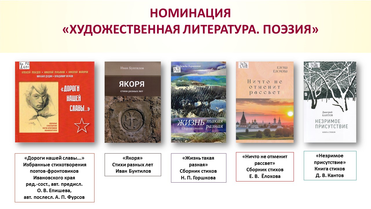 Дипломом номинанта в этой номинации отмечены следующие книги: «Дороги нашей славы…», избранные стихотворения поэтов-фронтовиков Ивановского края, редактор-составитель Ольга Епишева, автор послесловия Александр Павлович Фурсов; «Жизнь такая разная», автор Надежда Петровна Горшкова, «Ничто не отменит рассвет», автор Елена Владимировна Елохова, «Возмездие», автор Юрий Сергеевич Павлов, «…Чтобы смерти тебя не отдать!», автор Лада Вячеславовна Постоева, и исключительный случай: один автор Григорий Майский (Сергей Владимирович Жуков) увенчал свое дебютное появление в конкурсе получением диплома номинанта за 6 поэтических книг: «Братья дни», «Глаза правды», «Канун», «Крылья боли», «Тонкая материя», «Третья молодость»!