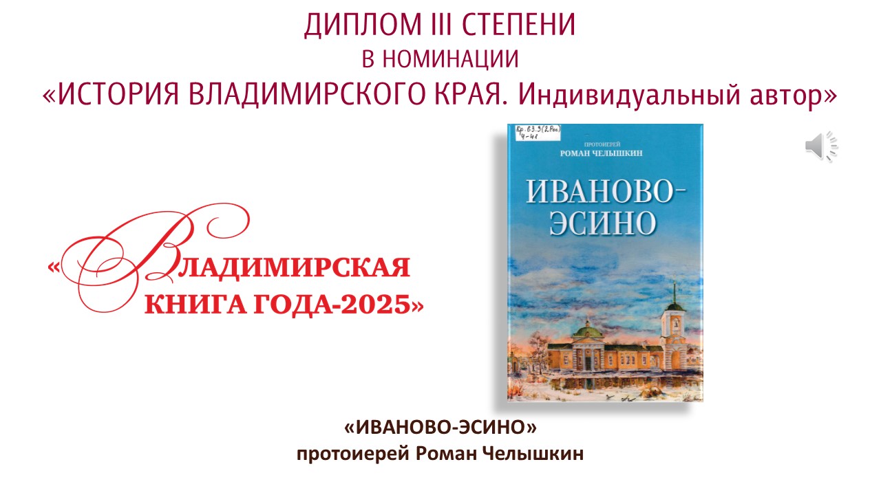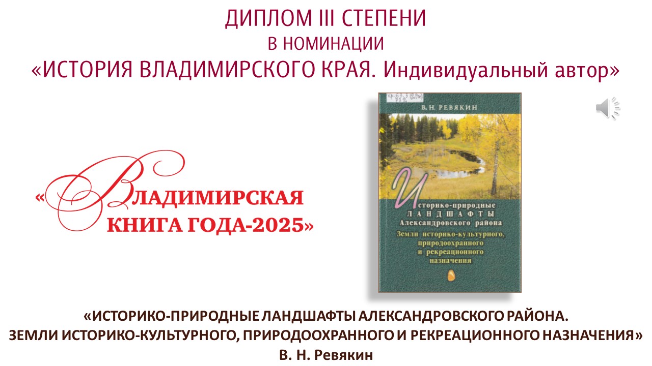 Дипломы 3 степени получили книги: «Историко-природные ландшафты Александровского района: земли историко-культурного, природоохранного и рекреационного назначения» – автор Владимир Никитович Ревякин, и «Иваново-Эсино», автор протоиерей Роман Челышкин.