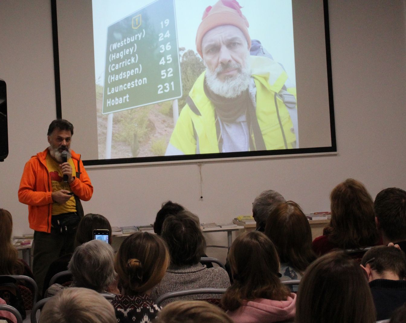 Послушать рассказ о путешествии по Австралии, Новой Зеландии и Океании осенью 2025 года пришло столько людей, что Антон даже расстелил свой спальник, чтобы некоторые гости могли слушать сидя на полу. «Кстати, в Австралии люди очень спокойно относятся к тому, что можно сидеть на полу, на тротуаре, на лестницах», – прокомментировал Антон и ситуацию, и фотографию на экране. – «Вот я сфотографировал какую-то школьную экскурсию: группа шла-шла по городу, а потом остановилась на отдых и дети сели прямо на тротуаре, пьют водичку, и нормально».