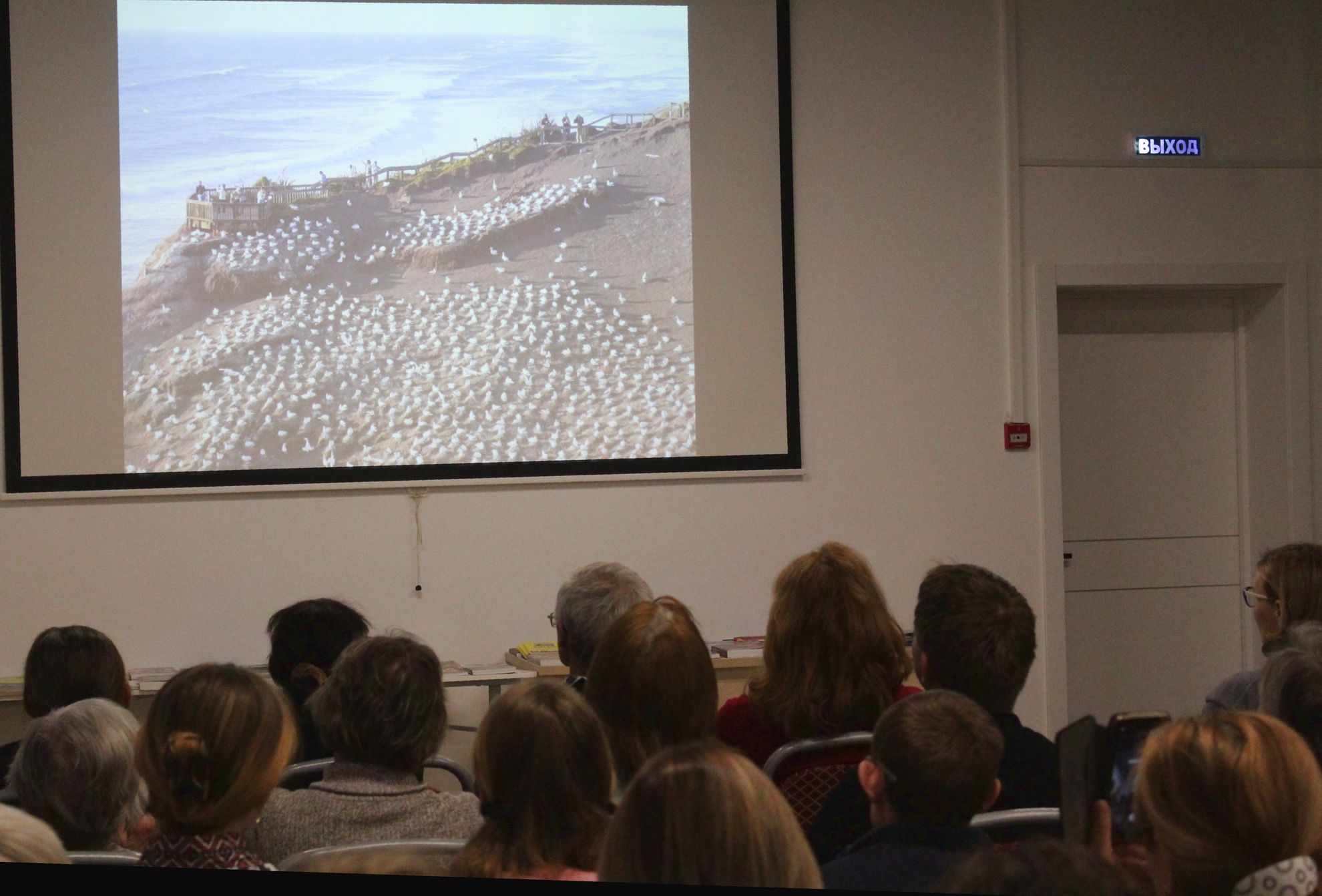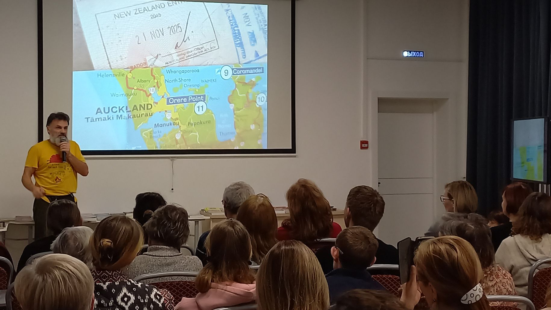 На экране сменяли друг друга с огромной скоростью сотни фотографий с австралийскими дорогами, новозеландскими морскими пейзажами, видами мегаполисов и небольших посёлков, портретами попутчиков и водителей-маори, иллюстрируя рассказ Антона. Все эти фотографии можно рассмотреть на видеозаписи прямого эфира, для удобства останавливая видео в любой момент.