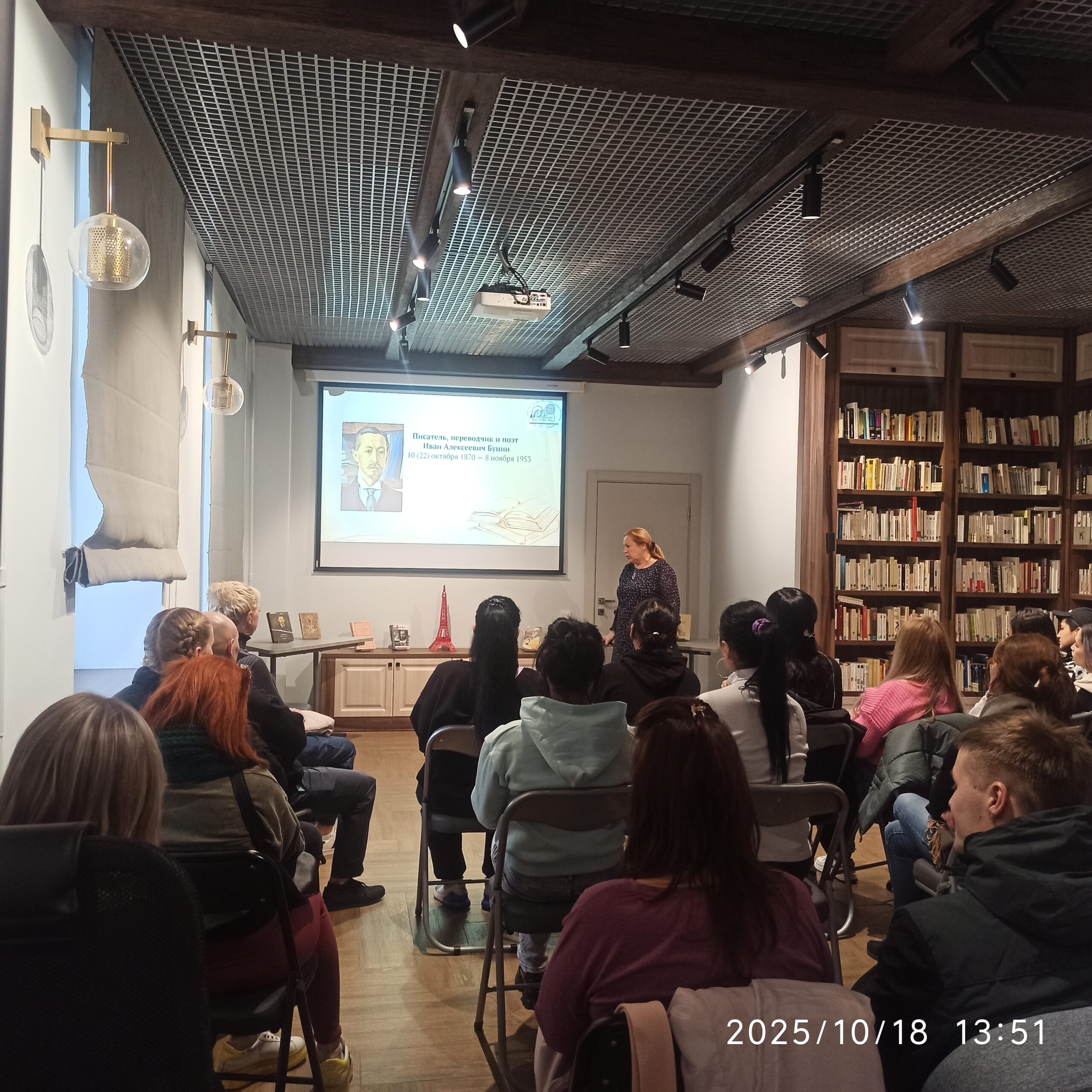 В субботу, 18 октября 2025 года, состоялся литературный час памяти писателя, Нобелевского лауреата Ивана Алексеевича Бунина. Гости мероприятия познакомились не только с творчеством автора, но и его Музой. Мероприятие прошло к 155-летнему юбилею со дня рождения выдающегося писателя, поэта и переводчика.