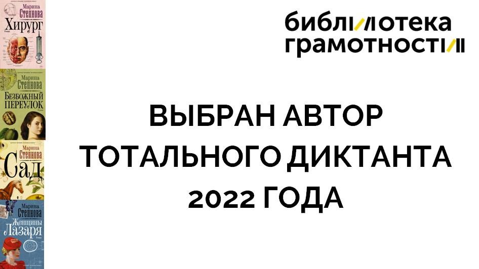 Ежегодно для диктанта выбирают текст известного писателя. В 2022 году автором текста тотального диктанта станет Мария Степнова. Ещё будучи студенткой Кишинёвского университета она начала сочинять стихотворения. С 2000-го года Мария Степнова стала писать прозу, а с 2005-го — романы. По результатам интернет-голосования в 2021 г. Мария Степнова стала победителем премии «Ясная поляна» в номинации «Выбор читателей» за роман «Сад» (2020). По словам писательницы, события рассказа, выбранного для Тотального диктанта, разворачиваются в Воронеже в конце XIX века. Главный герой рассказа – мальчик-подросток, который готовится к встрече со своей первой любовью.