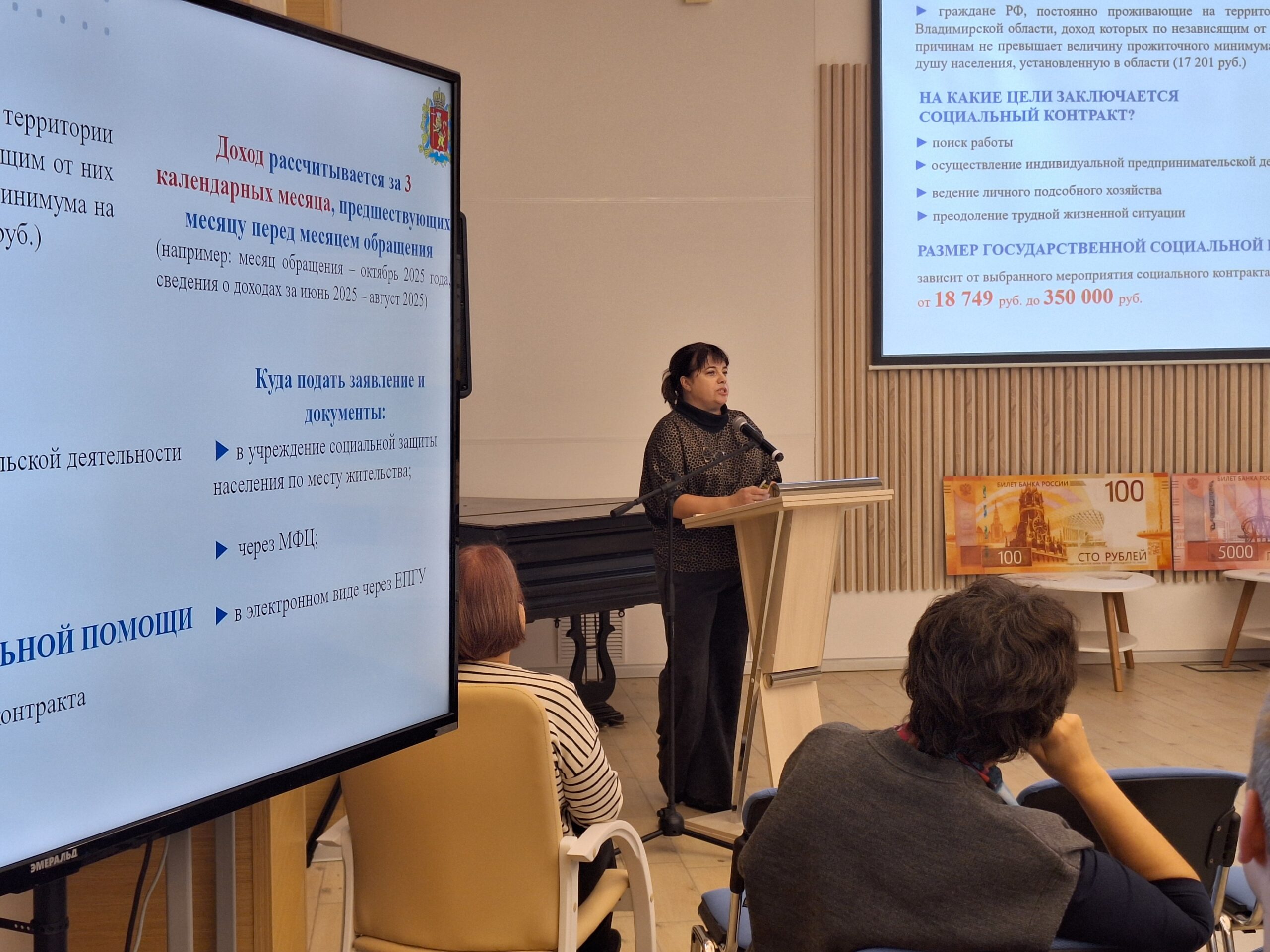 Аудитория внимательно слушала заместителя начальника отдела организации и назначения перерасчёта пенсий Жогову Наталью Юрьевну с докладом о вопросах пенсионного законодательства. И начальника отдела организации назначения детских пособий и социальных выплат Министерства социальной защиты населения Владимирской области с докладом о социальном контракте Морозову Елену Мирославовну.