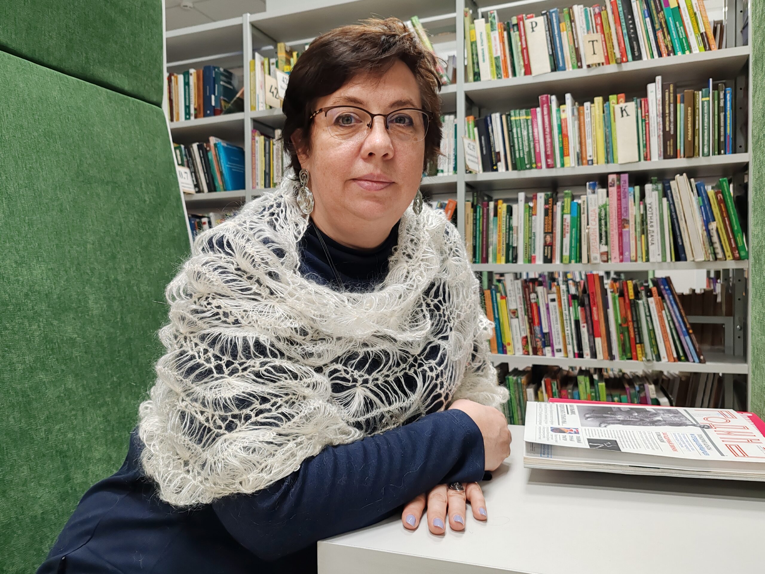 Женщина сидит на фоне стеллажей книг