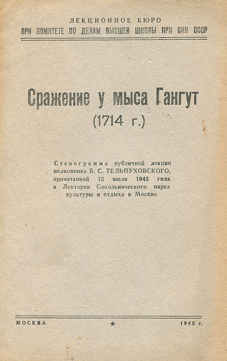 Большой интерес представляют три небольшие старые книги: Стенограмма публичной лекции полковника Б.С.Тельпуховского, прочитанная 15 июля 1945 года в Лектории Сокольнического парка культуры и отдыха в Москве «Сражение у мыса Гангут», «Русский флот и внешняя политика Петра I» Е. В.Тарле и «Гангутская победа» Я. С.Рыкачева.