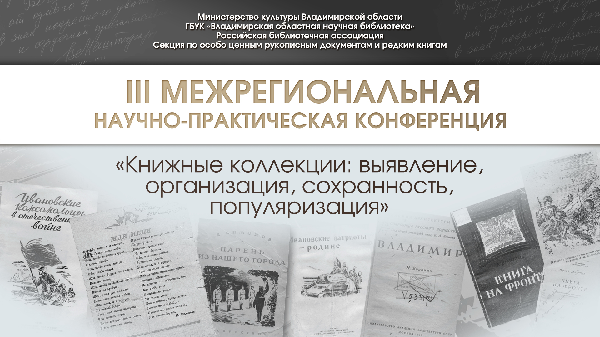 Приглашаем Вас принять участие в III Межрегиональной научно-практической конференции «Книжные коллекции: выявление, организация, сохранность, популяризация», которая состоится 27 ноября 2025 г. во Владимирской областной научной библиотеке.