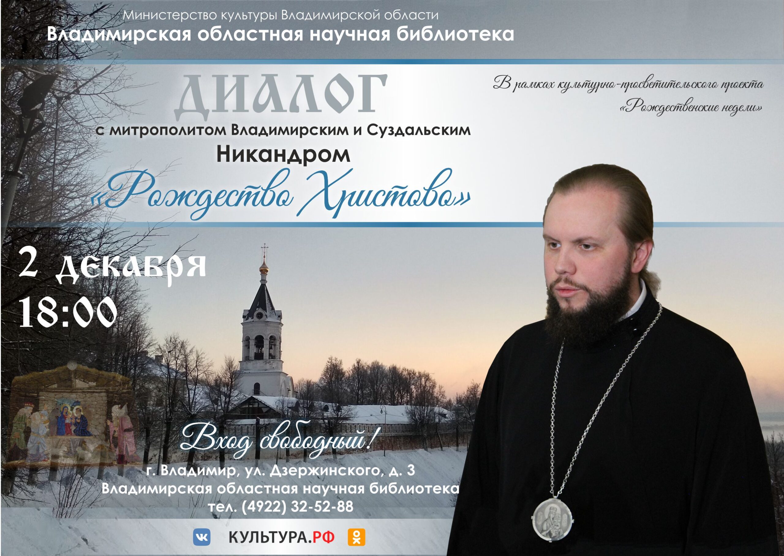 2 декабря 2025 года в 18:00 во Владимирской областной научной библиотеке в рамках культурно-просветительского проекта «Рождественские недели» состоится встреча с митрополитом Владимирским и Суздальским Никандром.
