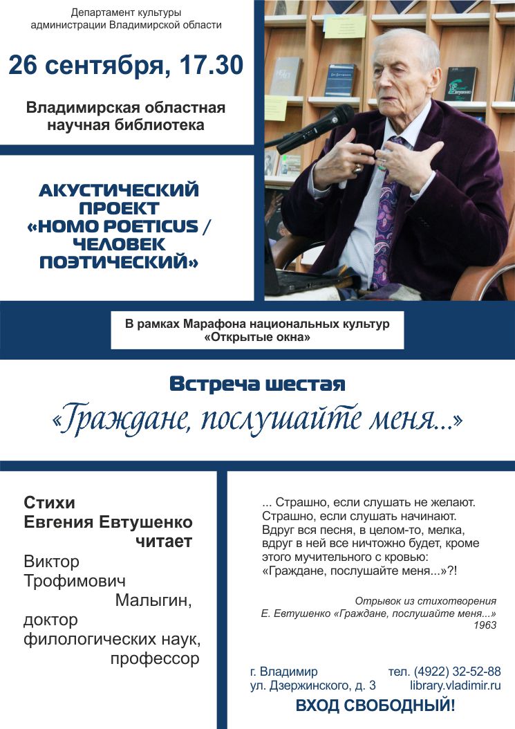 26 сентября в Областной научной библиотеке состоялась литературная гостиная Виктора Трофимовича Малыгина, посвященная творчеству поэту Евгению Евтушенко «Граждане, послушайте меня» в рамках культурно-просветительского проекта «HOMO POETICUS/ЧЕЛОВЕК ПОЭТИЧЕСКИЙ».